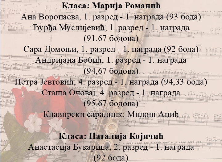 На такмичењу „Звуци флауте Сања Трајковић“ наши вредни ученици освојили су 7 првих и 3 друге награде! Честитамо ученицима, њиховим наставницама и клавирским сарадницима на постигнутом изузетном успеху!