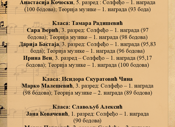 Наши вредни ученици освојили су 12 првих и 3 друге награде на 33. Републичком такмичењу из солфеђа и теоретских предмета, одржаном у Београду 6-7. децембра. Честитамо ученицима и њиховим наставницима на сјајним резултатима!