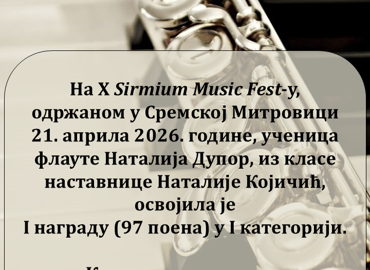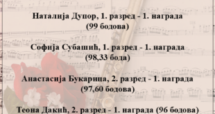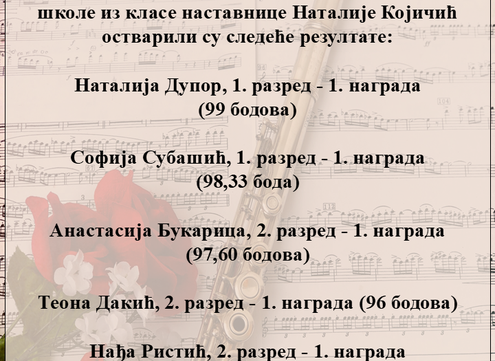 Ученици флауте, кларинета и саксофона освојили су 15 првих и 4 друге награде на Фестивалу „Исидор Бајић“, одржаном протеклог викенда у Новом Саду. Честитамо свим ученицима и њиховим наставницима, Марији Романић, Наталији Којичић, Далибору Лукину и Ђорђу Вујичићу, као и клавирским сарадницима, Милошу Андрићу, Бојану Кљајићу и Милошу Аџићу на …
