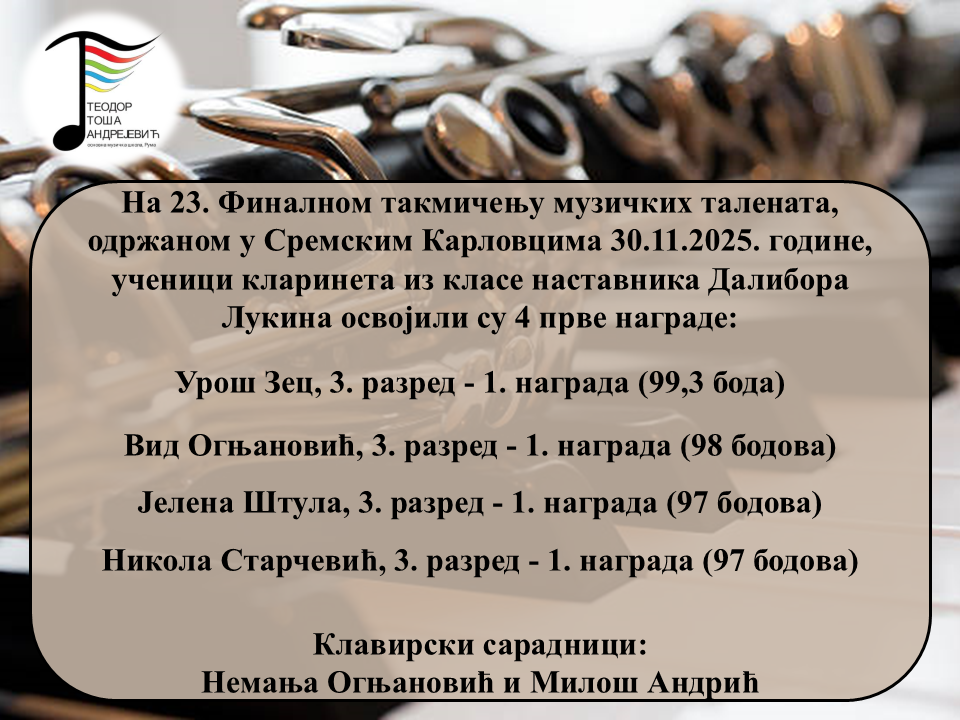 Ученици кларинета из класе наставника Далибора Лукина освојили су 4 прве награде на 23. Финалном такмичењу музичких талената у Сремским Карловцима. Честитамо ученицима, наставнику Далибору и клавирским сарадницима на сјајним резултатима! ❤