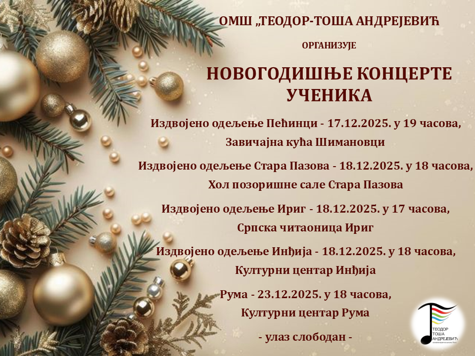 Основна музичка школа „Теодор-Тоша Андрејевић“ организује Новогодишње концерте ученика у Руми и издвојеним одељењима у Пећинцима, Старој Пазови, Иригу и Инђији. Улаз је слободан за све концерте. Добро нам дошли! ![]()