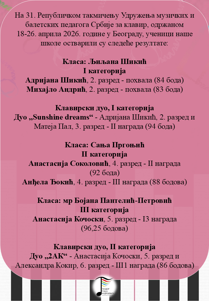 Честитамо ученицима клавирског одсека и њиховим наставницама на оствареним резултатима на Републичком такмичењу! 😊🎶🎶🎶🎶